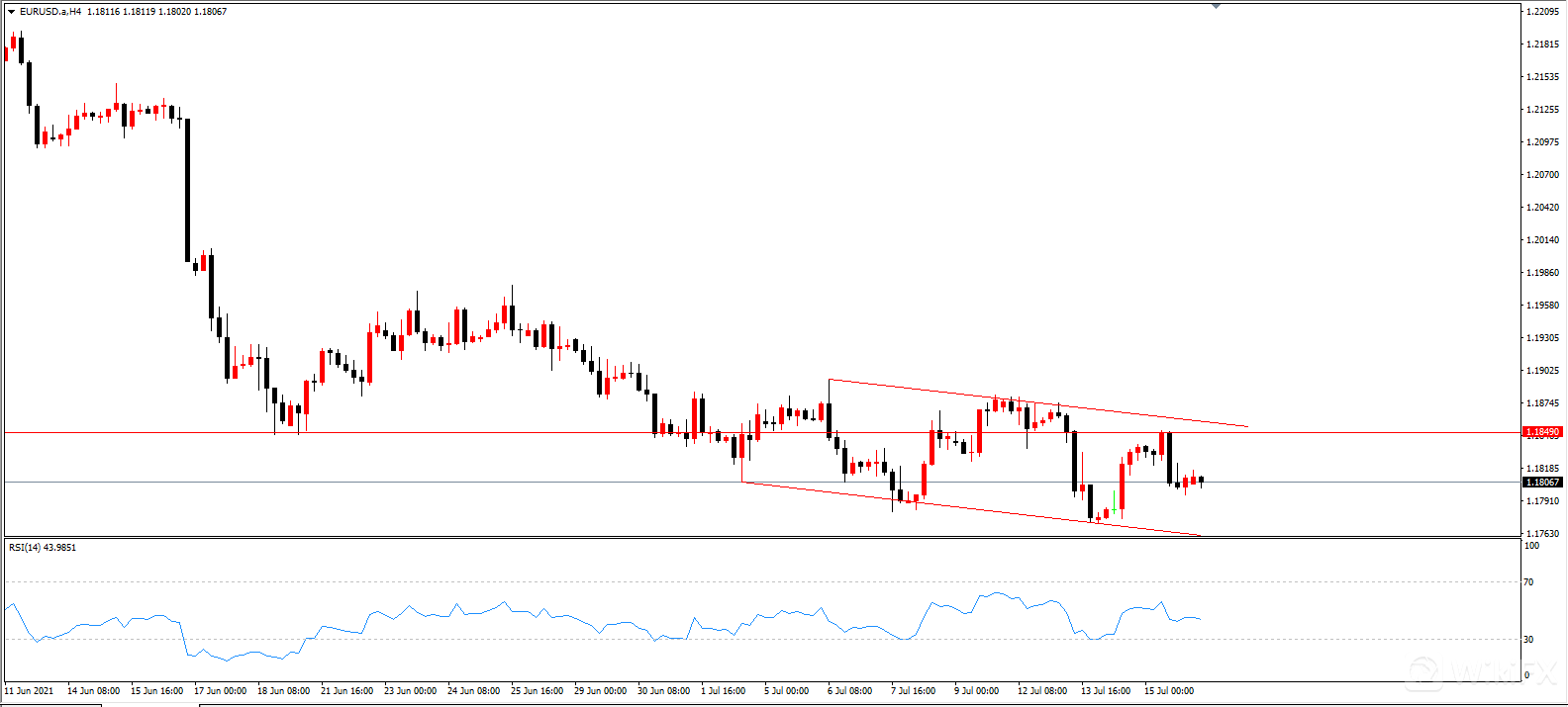 欧美在同样运行在区间内,但是更偏向下行通道:高点降低,低点降低。