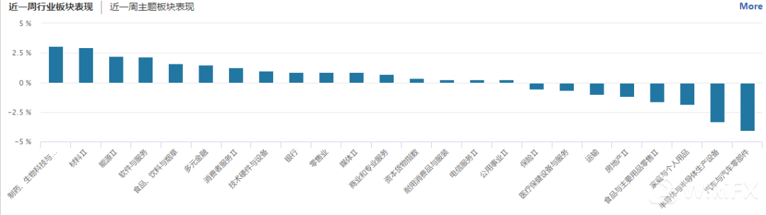 从行业板块表现来看,制药、材料、能源、软件与服务以及食品饮料等涨幅居前,汽车与零部件、半导体、房地产、运输等跌幅居前。