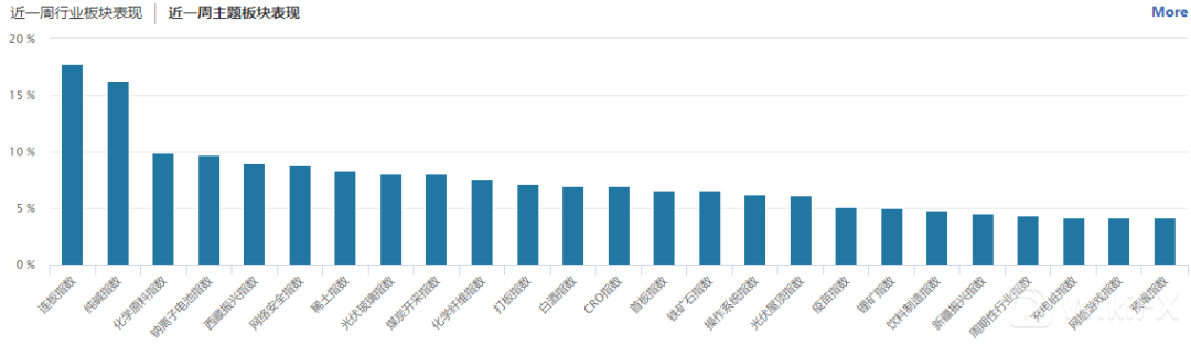 本周依然是概念板块表现较好,基本都有一定程度的涨幅,其中连板指数、纯咸指数、化学原材料、网络安全等涨幅居前,网络游戏、充电桩、周期性行业等涨幅相对落后。