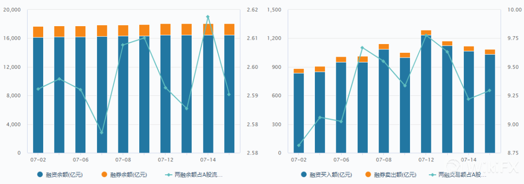 融资融券余额方面,截止7月15日,两融余额 18,082.01亿,占A股流通市值 2.59%。两融交易额 1,088.63亿,占A股成交额9.29%。其中两融余额较前期略有增加,但两融交易额占比有所降低。