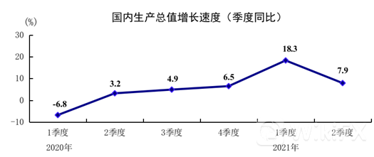 上半年国内生产总值532167亿元,按可比价格计算,同比增长12.7%,比一季度回落5.6个百分点;两年平均增长5.3%,两年平均增速比一季度加快0.3个百分点。分季度看,一季度同比增长18.3%,两年平均增长5.0%;二季度增长7.9%,两年平均增长5.5%。