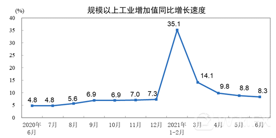 6月份,规模以上工业增加值同比实际增长8.3%,比2019年同期增长13.5%,两年平均增长6.5%。从环比看,6月份,规模以上工业增加值比上月增长0.56%。1—6月份,规模以上工业增加值同比增长15.9%,两年平均增长7.0%。