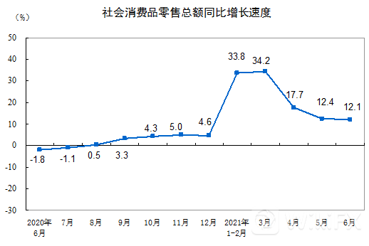 6月份,社会消费品零售总额37586亿元,同比增长12.1%;比2019年6月份增长10.0%,两年平均增速为4.9%。其中,除汽车以外的消费品零售额33719亿元,增长13.1%。扣除价格因素,2021年6月份社会消费品零售总额实际增长9.8%,两年平均增长3.2%。从环比看,6月份社会消费品零售总额增长0.7%。