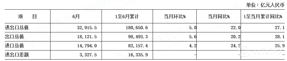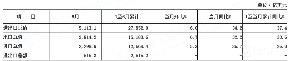 以人民币计,经季节调整后,2021年6月份进出口总值同比增长18.6%,其中出口增长14.7%,进口增长23.8%。以美元计,经季节调整后,2021年6月份进出口总值同比增长30.4%,其中出口增长26.1%,进口增长36.2%。