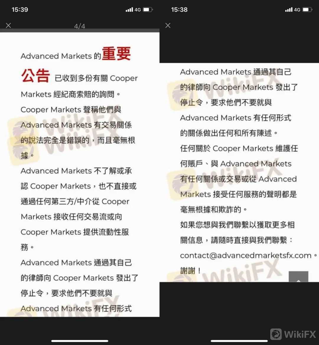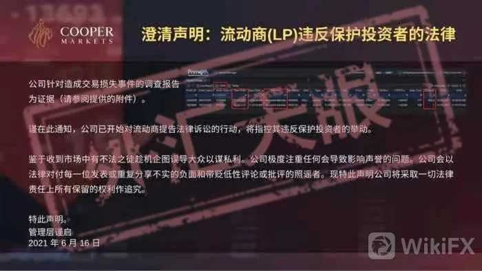 没有靠谱的监管牌照,就开始拉其他的外汇平台为其背书,Advanced Markets就是其中的受害者。在6月中旬,向瑞丰证券索赔无果的情况下,平台的投资者将火力转至了与瑞丰证券有合作关系的Advanced Markets。随后Advanced Markets发布公告表示,没有给向Cooper Markets提供流动性服务,并且已经通过法律途径禁止Cooper Markets再利用他们的名声为其背书。