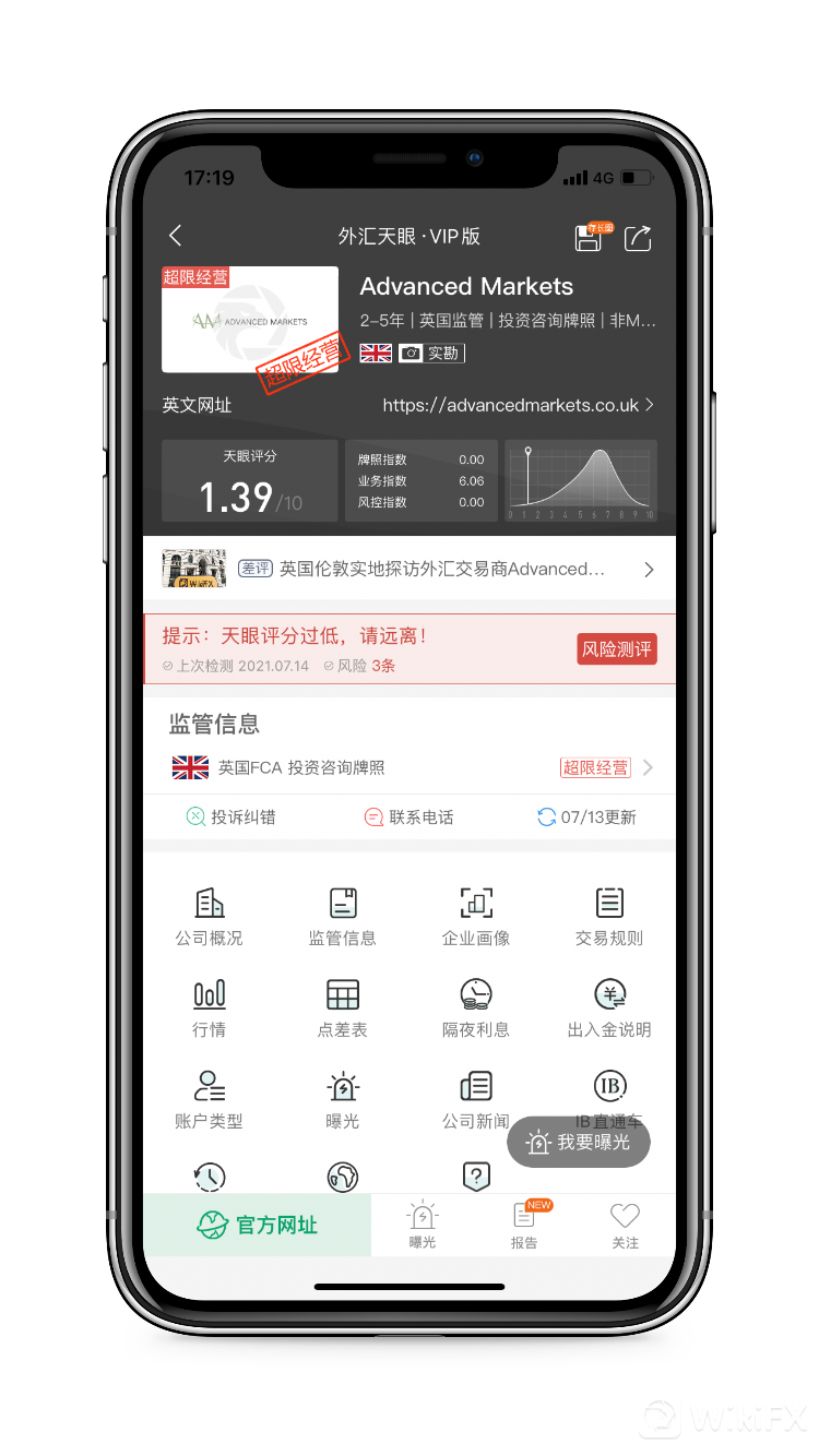 在外汇天眼上查询Advanced Markets,天眼评分1.39分,所宣称持有的英国FCA投资咨询牌照已经超限经营,且天眼探访了其英国伦敦的办事处,发现登记在监管处的地址并没有Advanced Markets的办事处,说明监管信息不实,存在风险。
