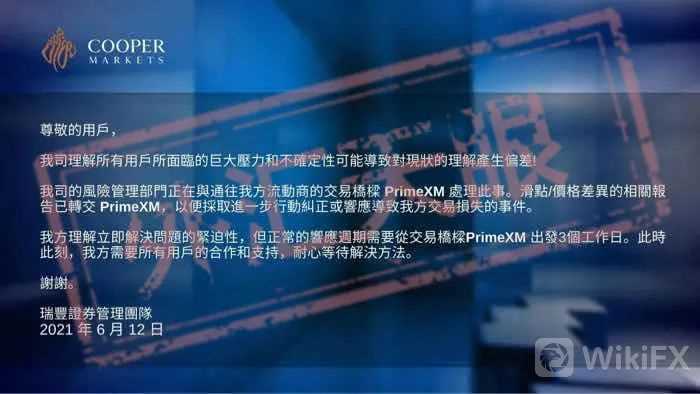 Cooper Maekets又称瑞丰证券,这个名字会给投资者造成一个误区,因为在香港也有个瑞丰证券,是个合法的证券公司,两者并无关系。外汇平台中的瑞丰证券号称注册于圣文森特和格林纳丁斯,在其官网和宣传资料中并没有提到是否获得任何司法管辖区的许可。