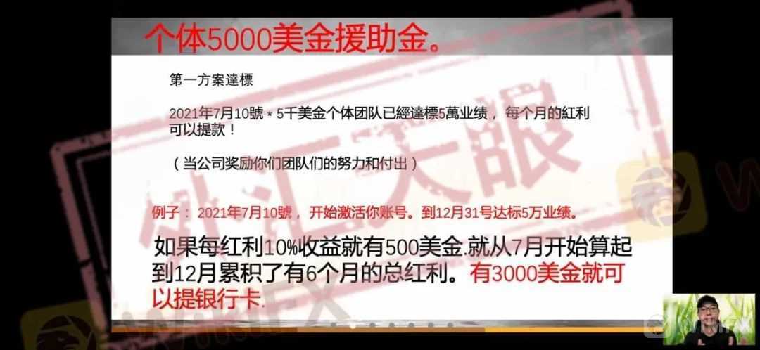 这个钱当然不是直接白给的,而是每个人5000美金是充值到账户里的,想要提取出来先要激活账户,通过每月的收益来提款。但是想要提款的前提条件是达标到5万业绩。