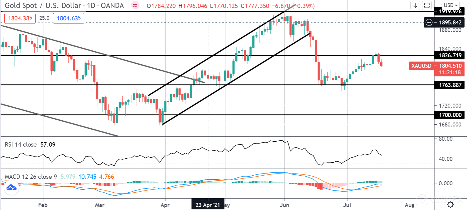 由于美元飙升打压市场情绪,本周黄金价格在沉重的抛售压力下开始。整个欧洲早盘,交易员一直在提供黄金。在周五一系列强劲数据的支持下,美元一直受到良好的买盘。 6 月零售销售远高于预期,总体读数为 0.6%,高于前一个月的 -1.7%,并远高于预期的 0.4%。核心读数甚至更高,为 1.3%,再次比上个月的 -0.9% 读数和 0.4% 的预测大幅跃升。该读数再次引发了对美联储将在未来几个月内被迫缩减量化宽松的预期。尽管美联储本身仍然坚持认为当前通胀和经济活动的上升将是暂时的,但最近的数据表明,经济复苏正在加速超过美联储的预测。在本周数据更加平静的情况下,交易员将密切关注任何与 COVUD 相关的头条新闻以及美联储政策制定者的任何评论,周五美国采购经理人指数数据是唯一需要关注的关键数据。