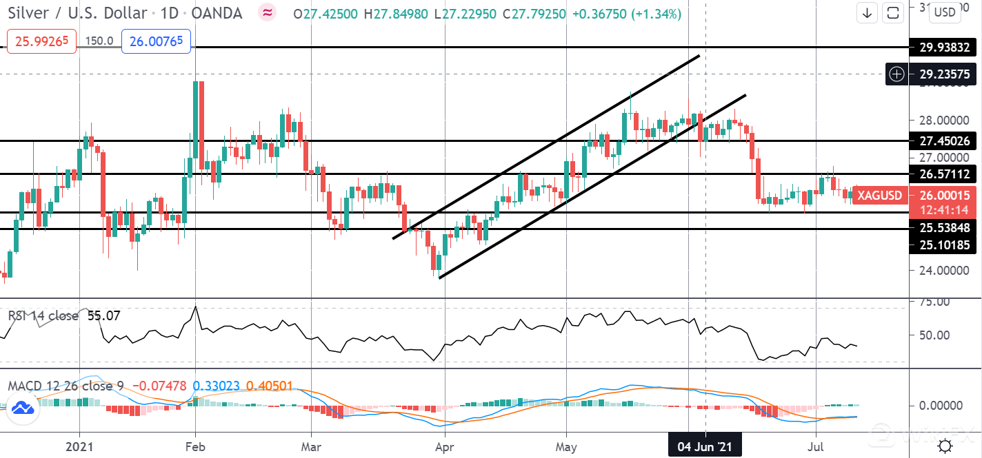 近期黄金的上涨使价格上涨以测试 1826.71 的阻力位。虽然价格短暂突破该水平,但卖家现在已将价格回落至该水平以下。 MACD 和 RSI 目前仍然为正,但两者都在转低。不利的一面是,需要关注的关键水平是 1763.88 水平。