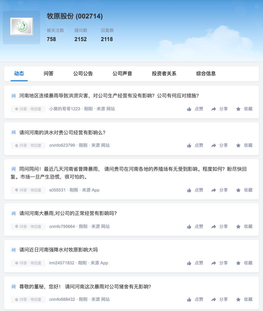 根据互动平台数据和各公司公告,截至发稿,尚未有公司在公告中透露业务受负面影响情况。据央视财经21日报道,牧原股份董秘称,特大暴雨目前未对牧原股份生产经营造成显著影响。