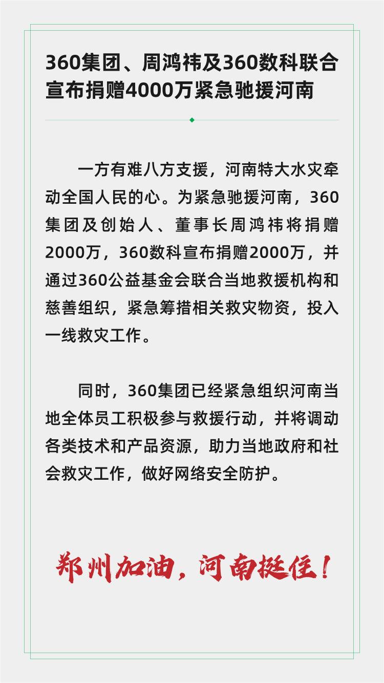 7月17日以来,河南连日暴雨,形成特大水灾,牵动着全国人民的心。360集团宣布“360集团及创始人、董事长周鸿祎将捐赠2000万,360数科宣布捐赠2000万,并通过360公益基金会联合当地救援机构和慈善组织,紧急筹措相关救灾物资,投入一线救灾工作。”