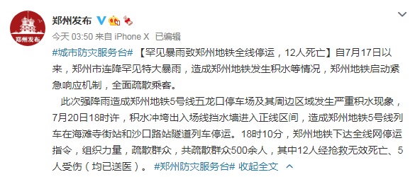 据郑州市委宣传部官方微博21日凌晨消息,自7月17日以来,郑州市连降罕见特大暴雨,造成郑州地铁发生积水等情况,郑州地铁启动紧急响应机制,全面疏散乘客。