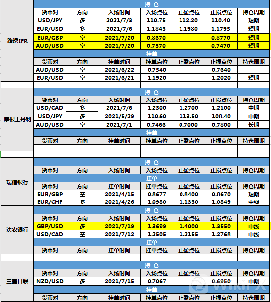 持仓方面,路透IFR、法农银行两投行仓位调整。 路透IFR欧元兑英镑入场点位调整至0.8670,止损点位调整至0.8770目前处于持仓中;澳元兑美元入场点位调整至0.7370,止损点位调整至0.7470,目前处于持仓中。法农银行英镑兑美元入场点位调整至1.3699,止盈点位调整至1.4000,止损点位调整至1.3550,目前处于持仓中。