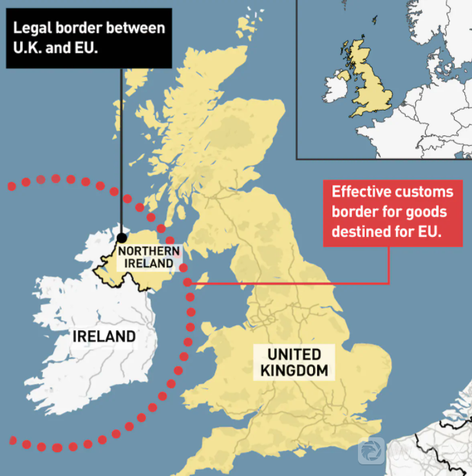 在去年英欧双方为了避免北爱尔兰与爱尔兰之间出现硬边界,共同签署了《北爱尔兰协议书》。根据协议,北爱尔兰获得了特殊的地位,成为欧盟与英国贸易关系的桥头堡。