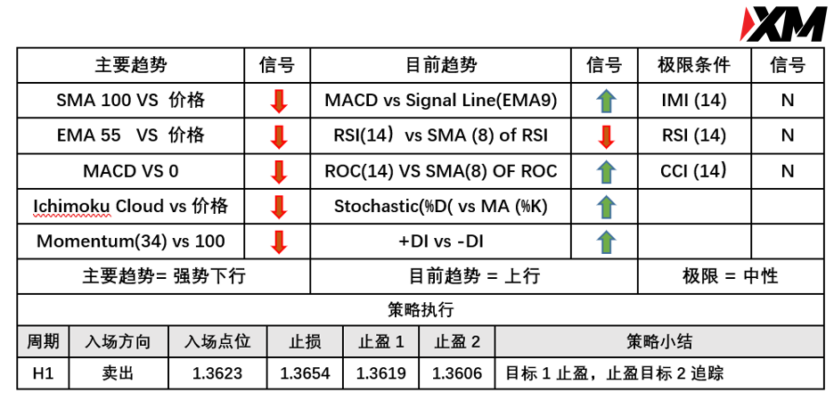 入场价位:1.3623,止损价位:1.3654,止盈目标一:1.3619,止盈目标二: 1.3606。