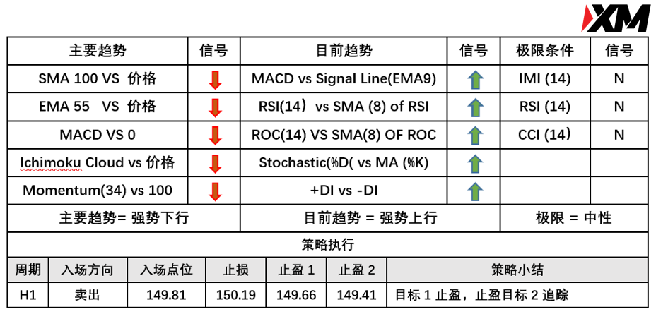 入场价位:149.81,止损价位:150.19,止盈目标一:149.66,止盈目标二: 149.41。