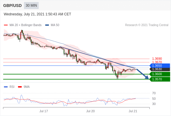 交易策略:在1.3650之下,看跌,目标价位为1.3600,然后为1.3570。