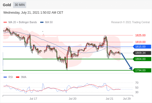 交易策略:在1815.00之下,看跌,目标价位为1804.00,然后为1794.00。