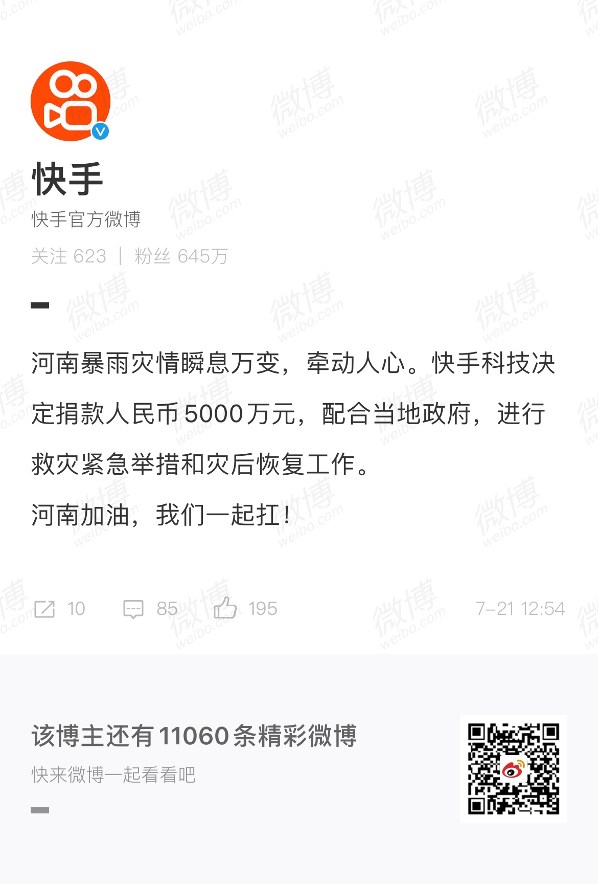 据快手官方发布的消息,快手科技决定捐款5000万元,并配合河南当地政府,进行救灾紧急举措和灾后恢复工作。