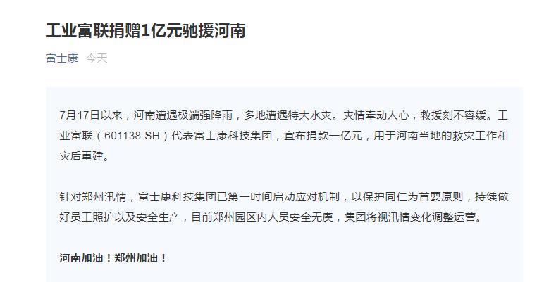7月17日以来,河南遭遇极端强降雨,多地遭遇特大水灾。灾情牵动人心,救援刻不容缓。工业富联(601138,股吧)(601138.SH)代表富士康科技集团,宣布捐款一亿元,用于河南当地的救灾工作和灾后重建。