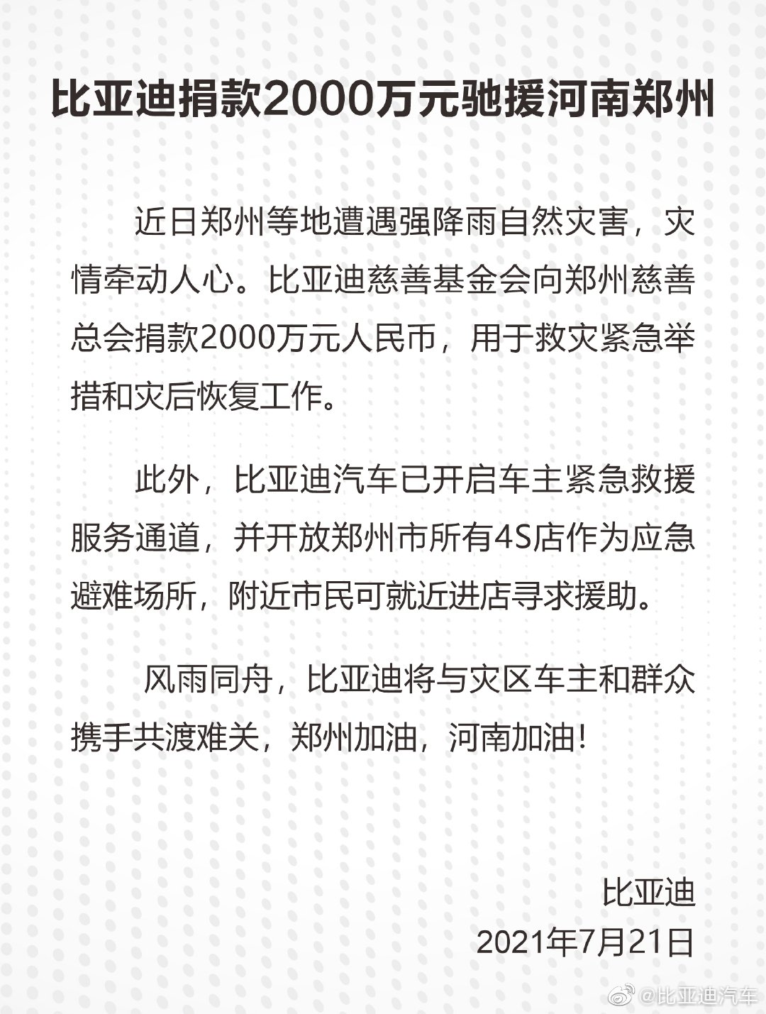 21日,比亚迪(002594,股吧)汽车销售有限公司公告,捐款2000万元驰援河南郑州,郑州市所有4S店作为应急避难场所。