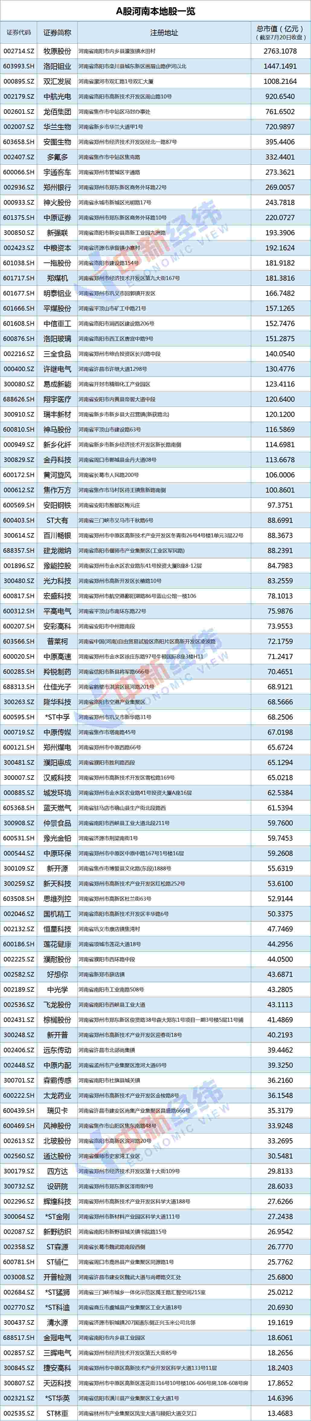 据Wind统计数据显示,按照注册地址划分,目前A股市场共计有91只河南本地股。以7月20日收盘价计算,总市值超千亿元的有三家,包括“猪茅”牧原股份(002714,股吧)、洛阳钼业(603993,股吧)、双汇发展(000895,股吧)。