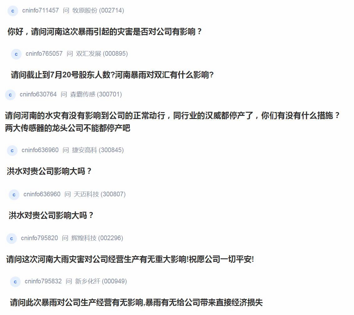 暴雨对区域内的上市公司造成了哪些影响?投资者们也在密切关注,沪深两大互动平台(上证e互动、深交所互动易)上提问络绎不绝。