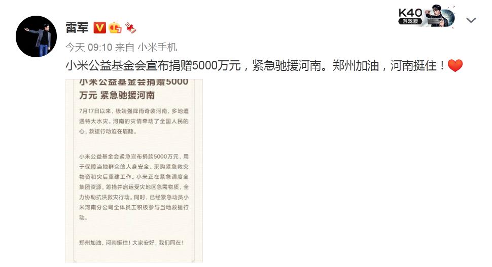 小米董事长兼CEO雷军表示,小米公益基金会宣布捐赠5000万元,紧急驰援河南。