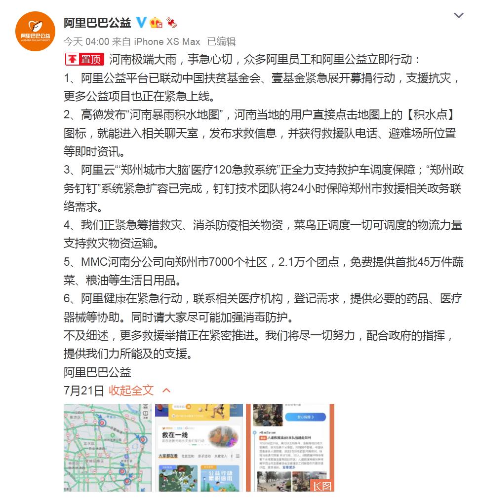 阿里巴巴公益表示,已联动中国扶贫基金会、壹基金紧急展开募捐行动,支援抗灾,更多公益项目也正在紧急上线。阿里云“‘郑州大脑’医疗120急救系统”正全力支持救护车调度保障;“郑州政务钉钉”系统紧急扩容已完成,钉钉技术团队将24小时保障郑州市救援相关政务联络需求。阿里健康联系相关医疗机构,登记需求,提供必要的药品、医疗器械等协助。阿里巴巴宣布追加1.5亿元捐款驰援河南。