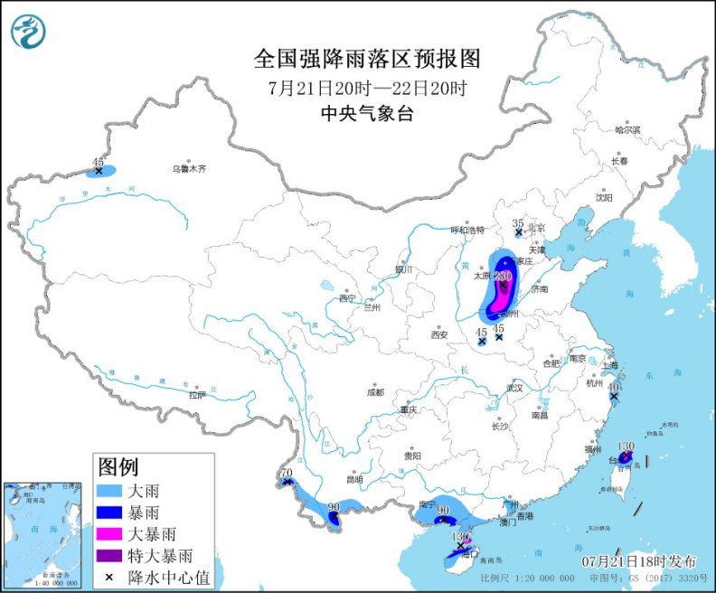 据中央气象台消息,预计,7月21日20时至22日20时,河南中北部、河北南部、山西东部以及广西东南部、雷州半岛南部、海南岛西北部、台湾岛北部等地的部分地区有暴雨到大暴雨,其中,河南西北部、河北西南部等地局地有特大暴雨(250~280毫米);上述部分地区伴有短时强降水(最大小时降雨量20~50毫米,局地可超过70毫米),局地有雷暴大风等强对流天气。中央气象台7月21日18时继续发布暴雨橙色预警。