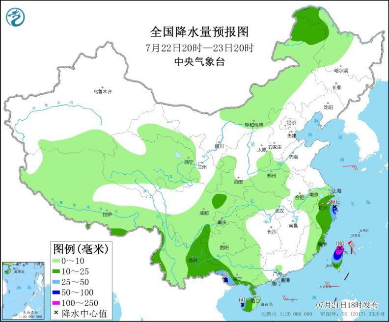7月22日20时至23日20时,浙江中东部、福建东部、云南东部、广西南部、广东西南部、海南岛西部及台湾岛等地有中到大雨,其中,浙江东部、台湾岛及海南岛西部等地部分地区有暴雨或大暴雨(100~180毫米)。