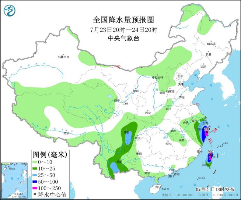 7月23日20时至24日20时,西南地区东部、江苏南部、上海、浙江中东部、福建东北部、台湾岛等地有中到大雨,其中,浙江东部等地局地有暴雨或大暴雨(100~200毫米)(见图4)。