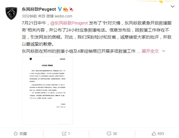 东风标致官方微博21日晚间发布消息称,7月21日中午,@东风标致Peugeot 发布了“针对灾情,东风标致紧急开启救援服务”相关内容,并公布了24小时应急救援电话。信息发布后,因救援工作存在不足,引发网友的质疑。对此,东风标致深刻检讨和反省,诚意接受大家的批评,并致以最诚挚的歉意。