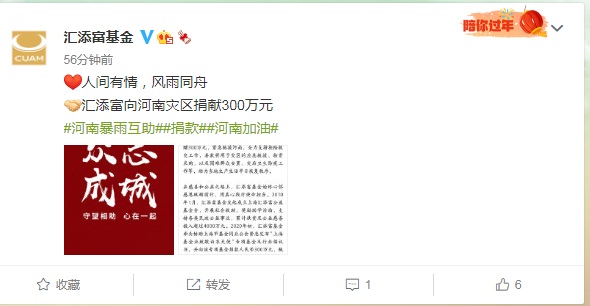 据汇添富基金官方微博21日晚间消息,汇添富向河南灾区捐献300万元。