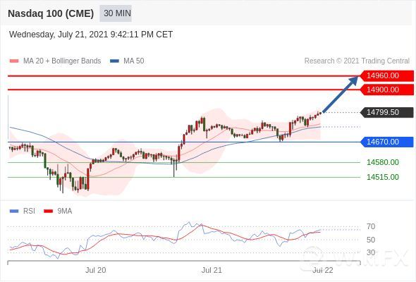 在 14670.00 之上,看涨,