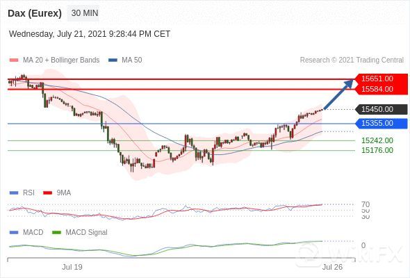 看涨,当 15355.00 为支撑位。