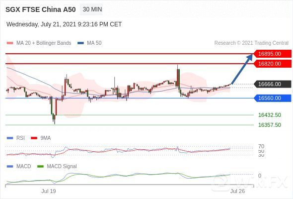 RSI技术指标超过50。MACD技术指标处在其信号线之上 看多。此外,价位高于其20个时期及50个时期移动平均线 ( 分别位于 16635.35 和 16639.60 )。