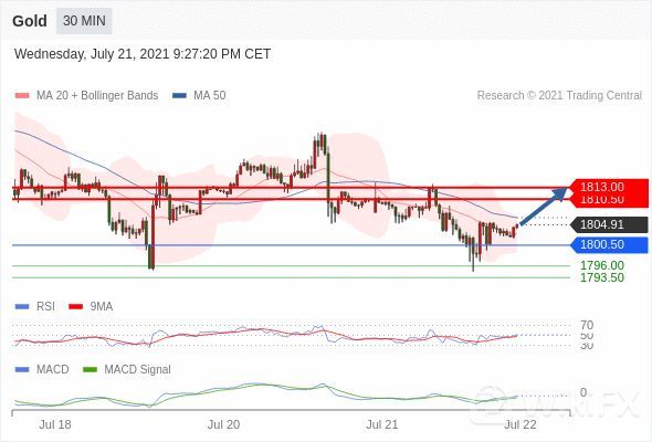 向下跌破 1800.50 ,将带来继续下跌的趋势,目标位为 1796 然后为 1793.50 。