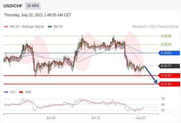 交易策略:在0.9200之下,看跌,目标价位为0.9160,然后为0.9145。