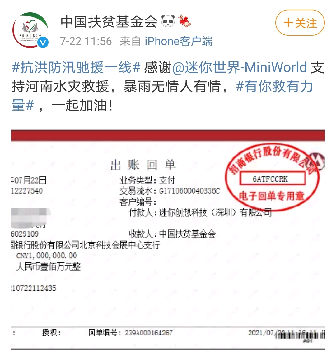《迷你世界》母公司迷你创想科技(深圳)有限公司通过中国扶贫基金会捐款100万元。捐款将用于保障当地群众人身安全和紧急采购救灾物资,愿所有同胞平安度过这次洪灾!