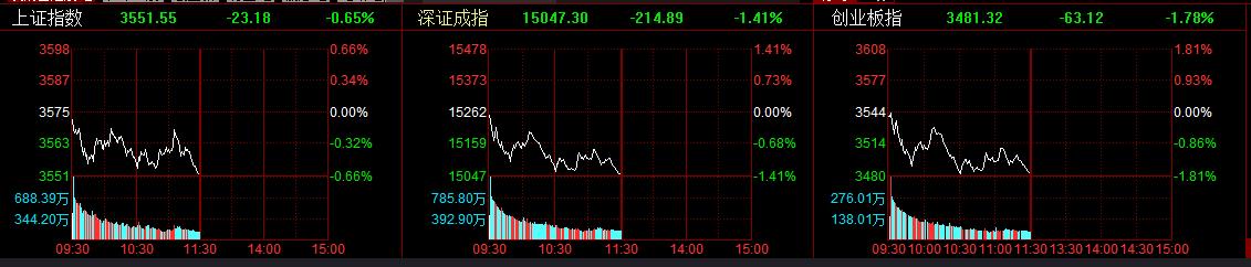 上证指数跌0.65%,报3551.55点。深证成指跌1.41%,报15047.30点。创业板指跌1.78%,报3481.32点。