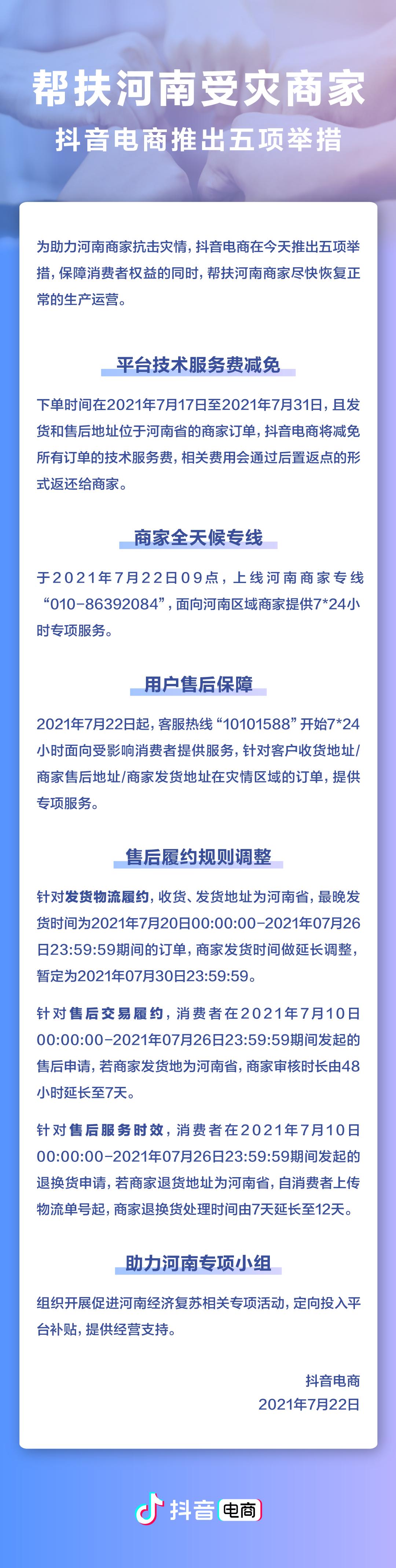7月22日,抖音电商宣布面向河南商家推出减免技术服务费、延长商家发货和售后服务时间、开通商家专线服务等五项扶持措施,在保障消费者权益的同时,助力河南商家抗击灾情,尽快恢复正常的生产运营。