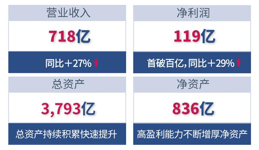旭辉控股2020年业绩报告显示,集团实现营业收入约718亿,同比增长27.2%;净利润首次突破百亿,达119亿,同比增长29%;总资产规模达到3793亿,净资产规模836亿。在取得高速业绩增长的同时,旭辉维持着健康的财务指标,公司净负债率64%,加权融资成本降至5.4%,维持行业较低水平。