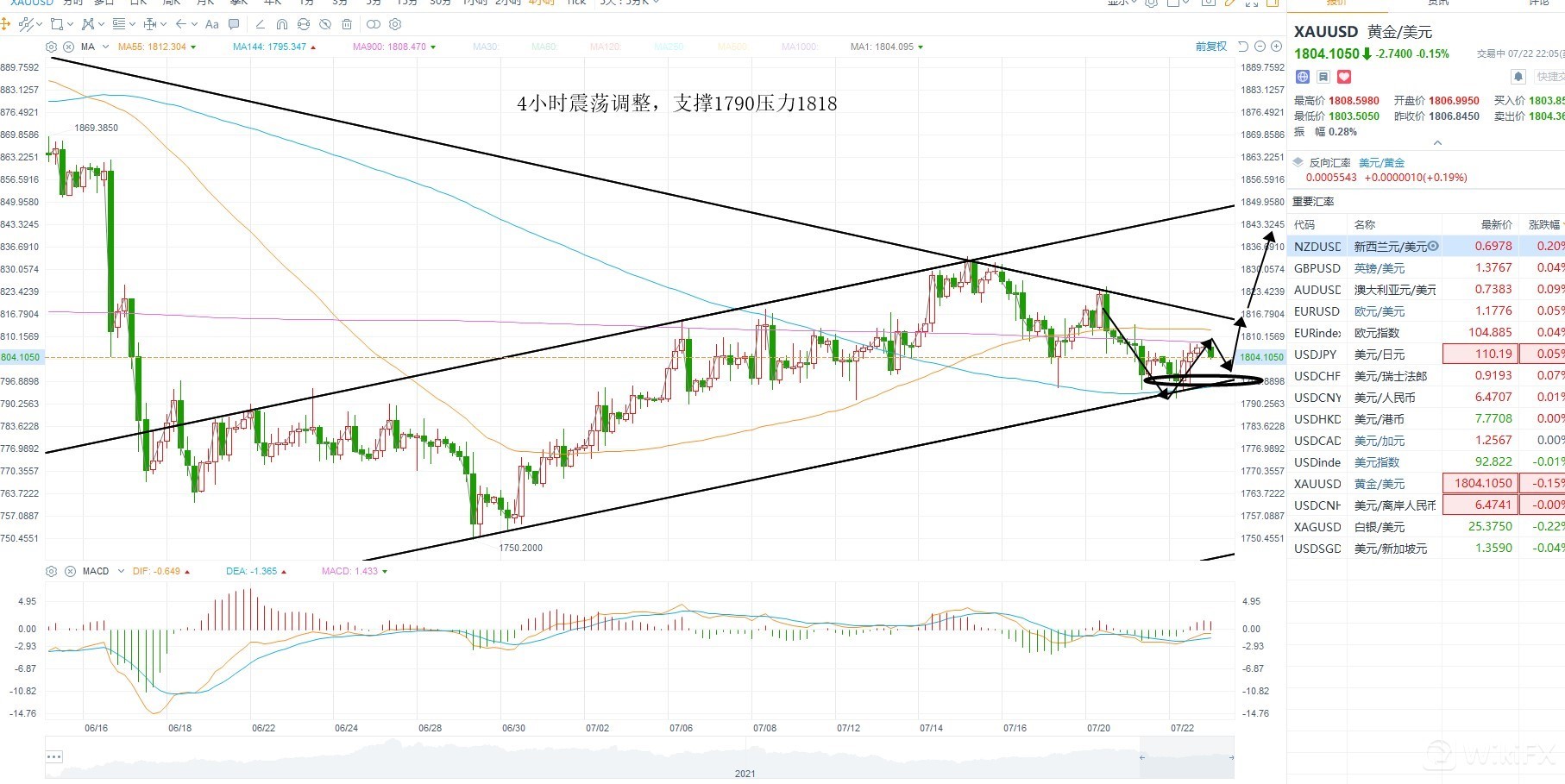 金价维持区间震荡,短期结构上没有大的改变,而基本面上也没有外力推动价格出现方向选择,短期按照技术层面走势对待,等待下次美联储议息会议给出方向,技术层面上,这里的回调可以看作是4小时级别的二浪回踩,若短期不再跌破1790则有望形成三浪上涨,等待突破即可,日内重要压力1818