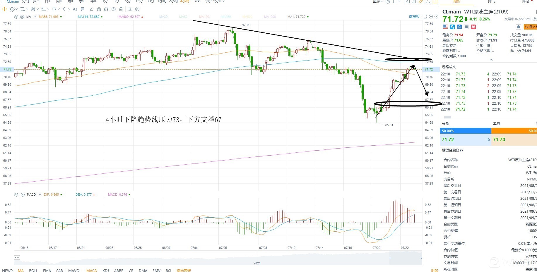 美原油持续反弹,从基本面上来看,EIA库存数据下降推动供给端走强,支撑油价,而经济数据复苏则推动需求走强,因此在下跌之后大幅反弹,不过目前依然是震荡下行,没有出现多头反转,因此耐心等待结构变化,日内下降趋势线压力73成为短期多空分水岭,若突破73则有望向上测试前高,不破则震荡回踩67美元附近支撑