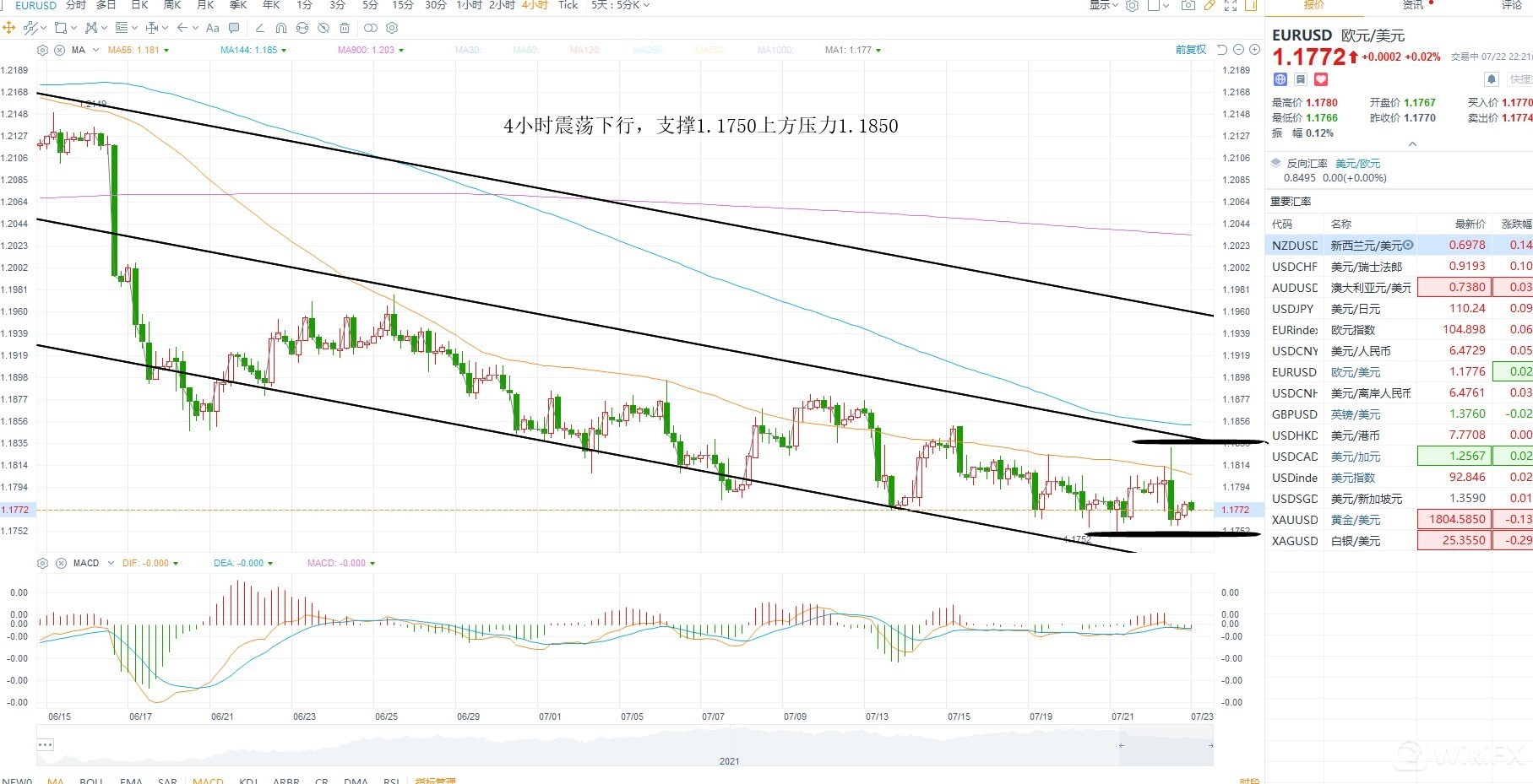 欧美继续震荡下行,而欧央行利率决议继续保持宽松符合市场预期,同时美元指数并未出现下跌,只是震荡,所以短期欧美有继续下行的风险,从技术层面上来看,4小时无法站上1.1850则不排除新低的可能性,短期等待企稳为主,关注美元是否在93.5附近回落,下方重要支撑1.1700,跌破则打开下行空间