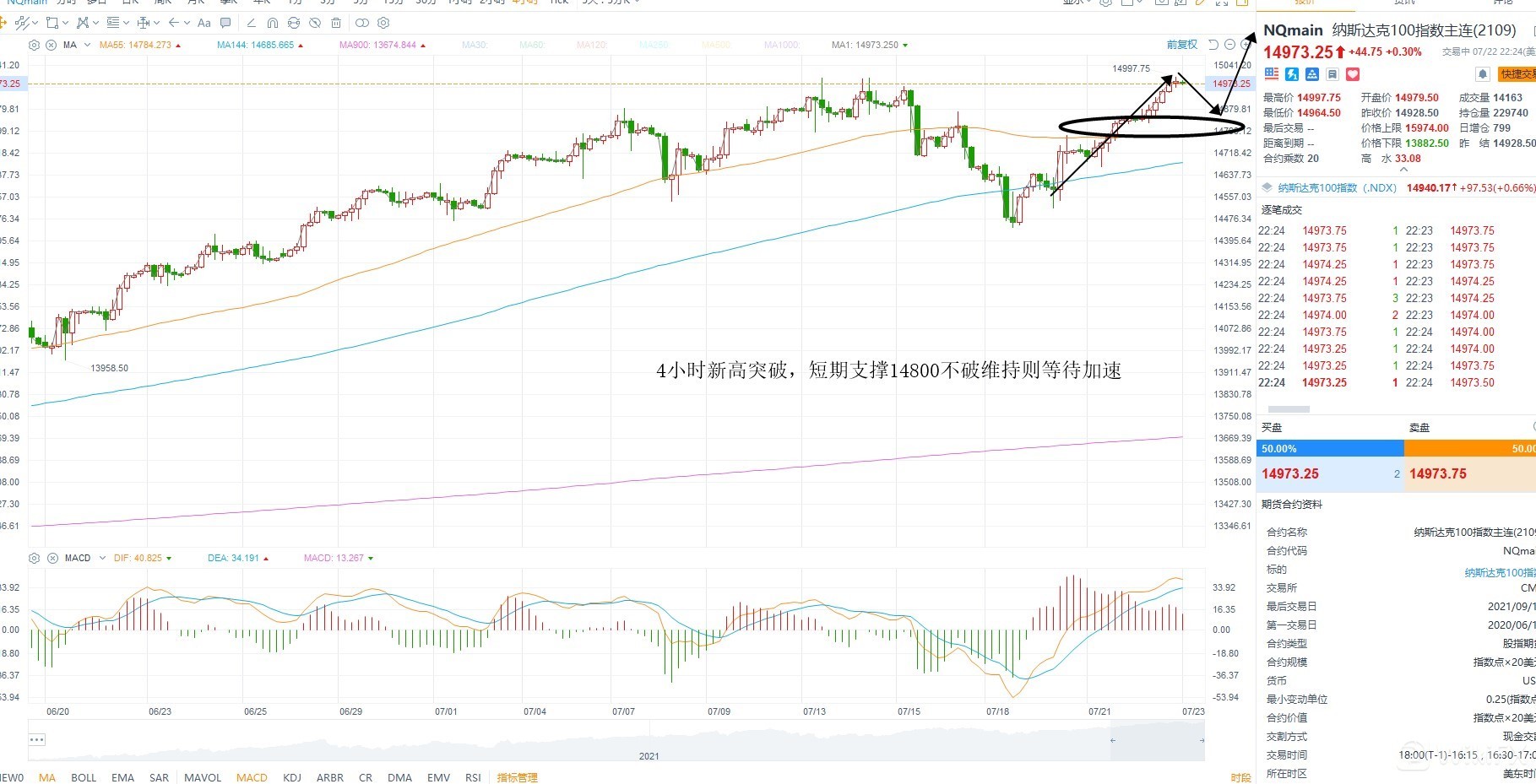 纳斯达克指数再创新高,接近15000整数关,短期而言市场风险偏好回暖,推动股市走强,不过这里的新高需要确认,是否存在加速的可能性,因此回踩不能再次跌破14800支撑,若跌破则突破失败,继续回踩箱体下沿,日内关注美债收益率曲线的变化,等待回踩支撑确认,跌破14800则下方有可能再次回踩14400,站稳15000则向上加速