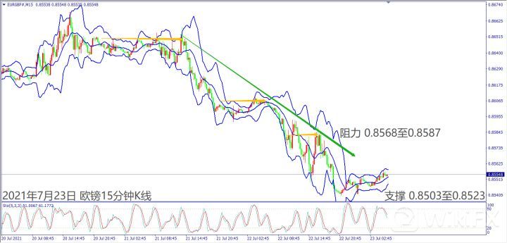 日级别线图,连续下跌形成倒V反转,移动均线空方排列,延续空方跌势;15分钟K线,短线出现盘跌走势,下降趋势线反压冲不过,大有可能回测支撑。