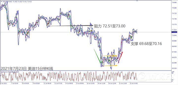 日级别线图,连续上涨突破10日均线,下降趋势线冲不过,大有可能回测60日均线;15分钟K线,近期出现箱形反转,73美元盖头反压,不排除回测70美元支撑。